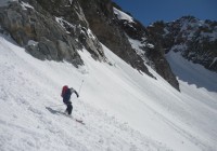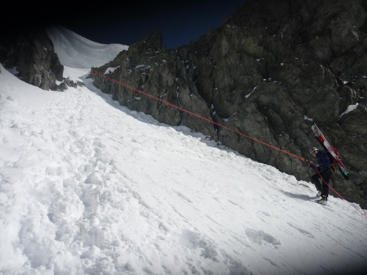 Après les classiques photos sommitales nous rejoignons le col Emile Pic ou le haut du col, légèrement en glace, nous oblige à tirer un rappel. Puis c’est la première descente du raid, qui nous fait vite déchanter … la neige est croutée,immonde et c’est la boite assurée un virage sur deux ! Le genre de pentes enneigées qui fait penser que sur Terre il existe des coins beaucoup plus agréable où vivre !