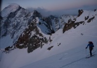 5h30 : Nous remontons une nouvel fois le glacier blanc avec, cette fois-ci, le Dôme des Écrins pour objectif. Arrives à 3900 m (100 m sous le sommet) nous renonçons de finir : on est dans la poisse, au milieu des séracs, avec du vent, quelques flocons et des onglets tenaces ! Exceptée la météo, la descente du Dôme jusqu’au bas du col Emile Pic fut top.